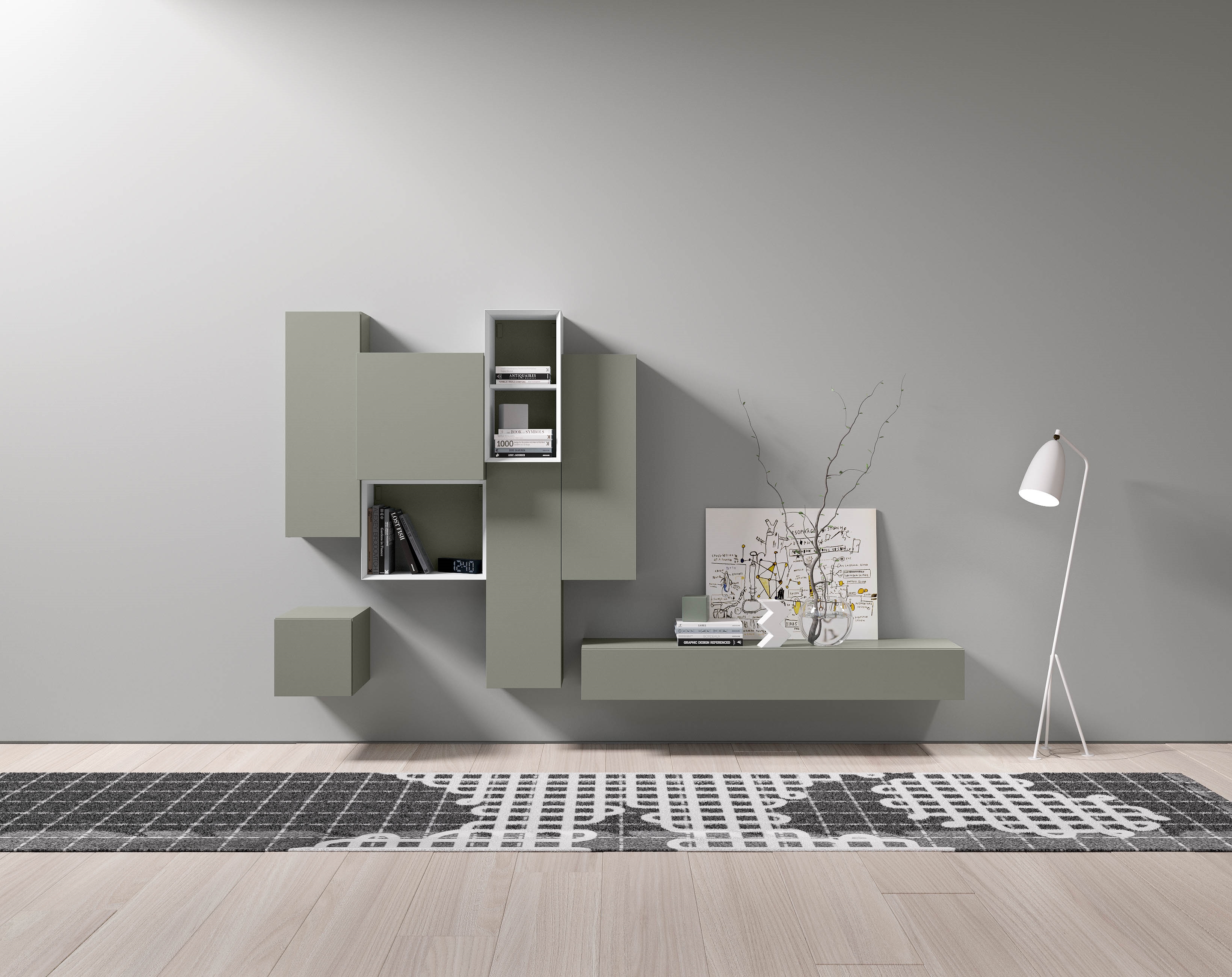Composizione parete giorno Pianca modello Spazio laccato opaco argilla, cappuccino, bamboo e bianco.